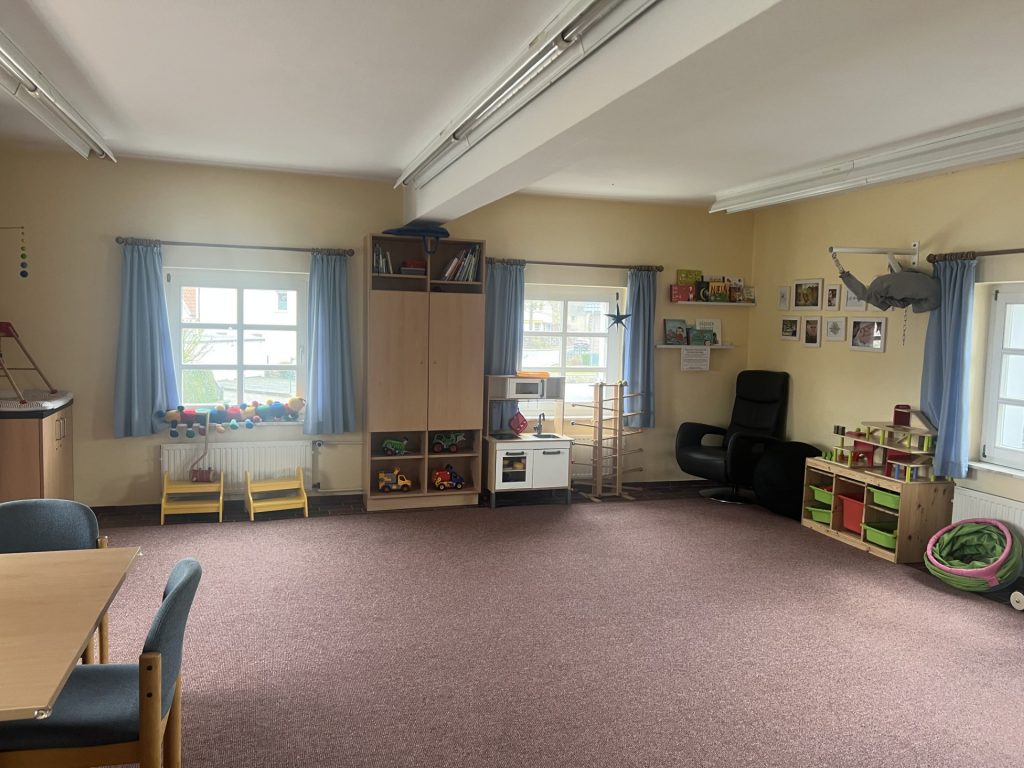 Der Gruppenraum ist liebevoll ausgestattet mit einem Wickeltisch, einer kleinen Küchenzeile, einem Tisch mit Stühlen, einem großen Teppich sowie reichlich altersgerechtem Spielzeug.
